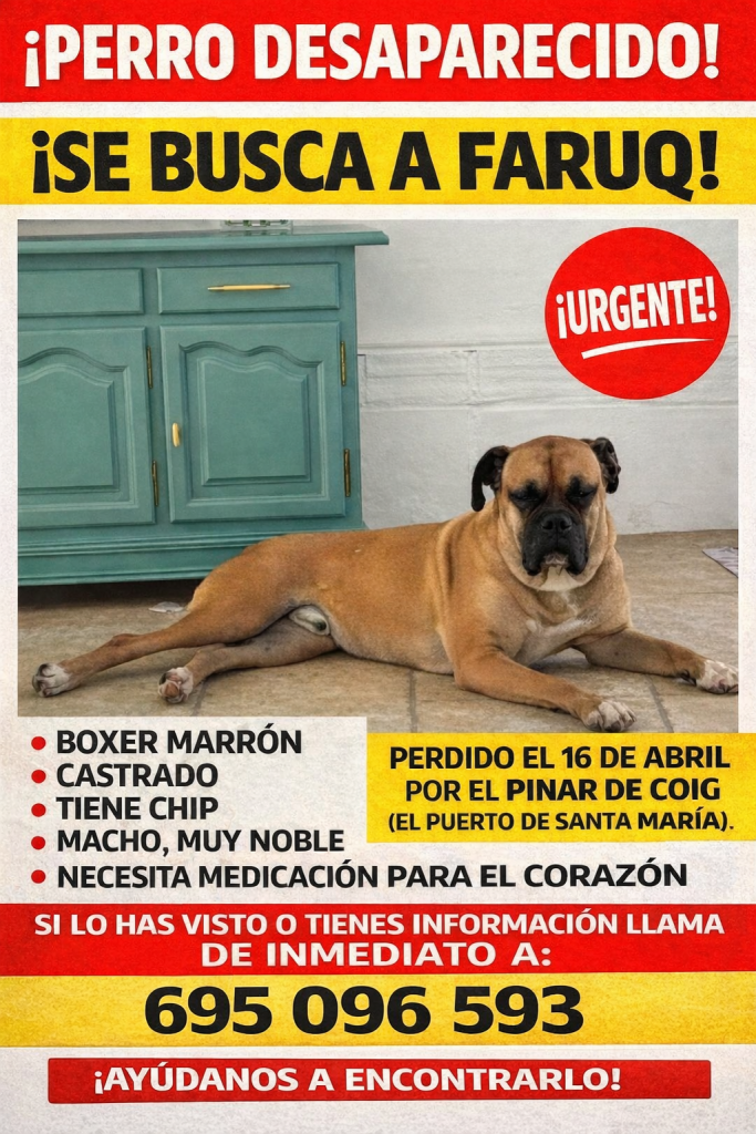 La familia pide a cualquier persona que pueda haber visto al perro o tenga información relevante que contacte de inmediato con la Policía Local o con las protectoras de la zona. Cualquier dato, por pequeño que parezca, puede ser clave para que Faruq regrese a casa cuanto antes. Si lo han visto, por favor, póngase en contacto a este número de teléfono: 695 096 593 (Ana).