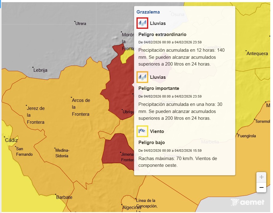 La Agencia Estatal de Meteorología (Aemet) ha activado el aviso rojo por lluvias para la jornada del miércoles 4 de febrero en el municipio de Grazalema ante la previsión de precipitaciones excepcionalmente intensas, que podrían dejar más de 140 litros por metro cuadrado en 12 horas y superar los 200 litros en un solo día.