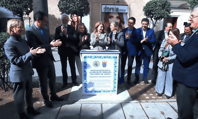 El Ayuntamiento de Jerez ha rendido homenaje al turno de oficio del Colegio de Abogados dedicándole el bulevar situado frente a su sede en la calle Sevilla, donde se ha inaugurado un monolito con la inscripción “Bulevar dedicado a la abogacía jerezana del turno de oficio” en reconocimiento a la labor que realizan los profesionales de este servicio esencial.