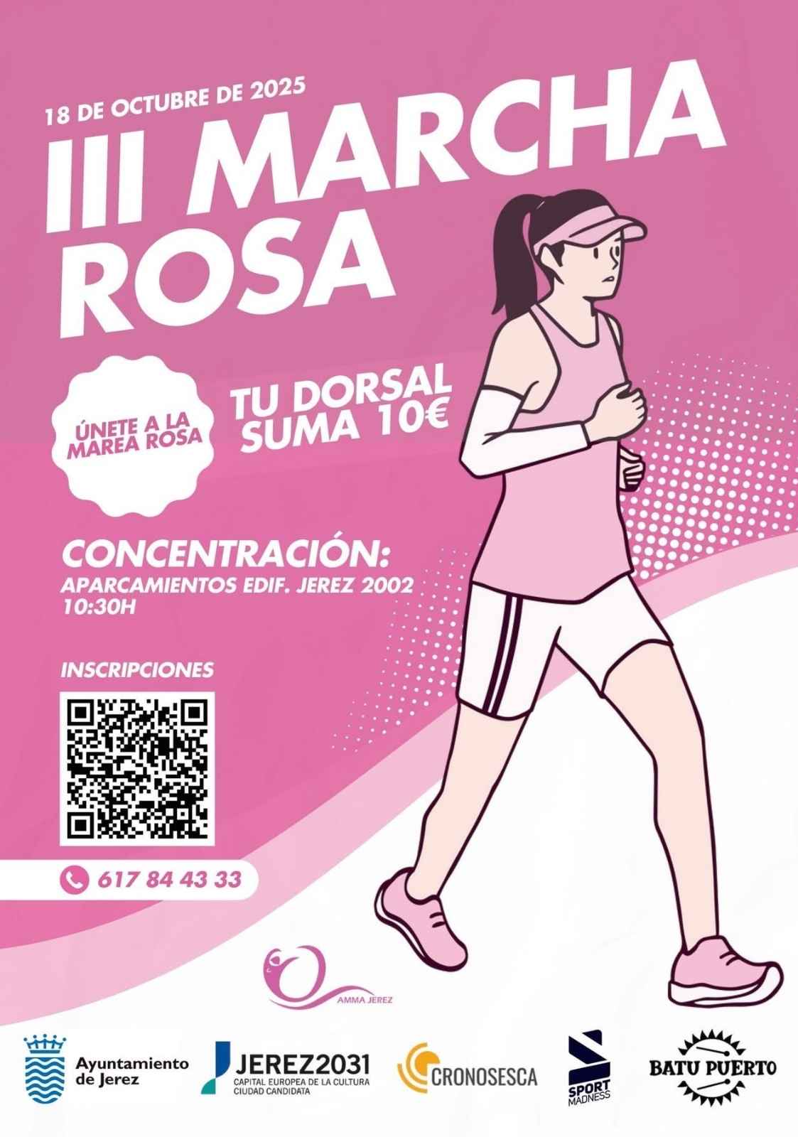 La salida estará en el Estadio Municipal de Chapín y finalizará en la Plaza del Arenal. La marcha está compuesta de 5 kilómetros para sensibilizar sobre el cáncer de mama. Si todavía no te has inscrito, puedes hacerlo usando el código QR o llamando al 617 84 43 33.