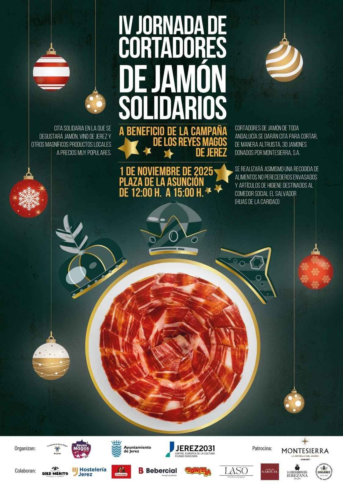 La plaza de la Asunción acogerá el próximo sábado 1 de noviembre, Día de Todos los Santos, la IV Jornada de Cortadores de Jamón Solidarios a beneficio de la campaña de los Reyes Magos de Jerez, una cita solidaria en la que locales y visitantes podrán disfrutar de la degustación de jamón, vino de la tierra y otros productos locales a precios para todos los bolsillos.