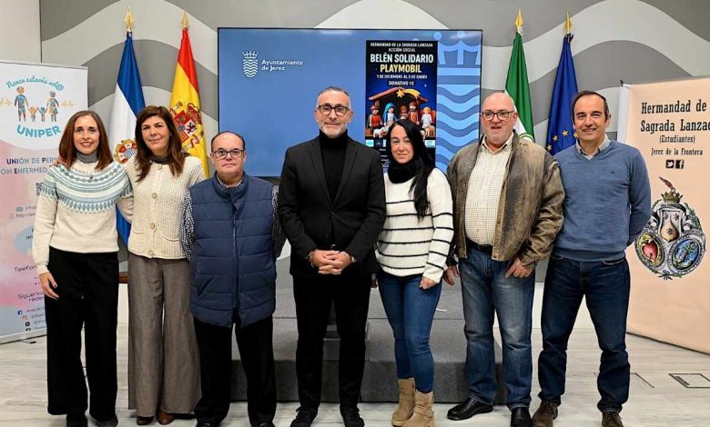 El delegado de Salud y Deportes, Tomás Sampalo, presentó junto a la Hermandad de La Lanzada una nueva edición del Belén Solidario Playmobil, cuya recaudación se destinará este año a la Asociación Uniper, integrada por familias de la provincia de Cádiz afectadas por enfermedades raras.