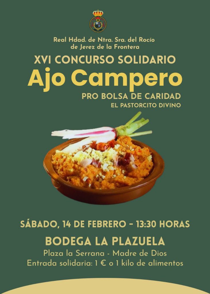 La Hermandad del Rocío de Jerez celebrará este sábado 14 de febrero de 2026 el XVI Concurso de Ajo Campero – Convivencia de Peñas, un evento solidario que tendrá lugar en la Bodega La Plazuela (Plaza de la Serrana) a partir de las 13:30 horas.